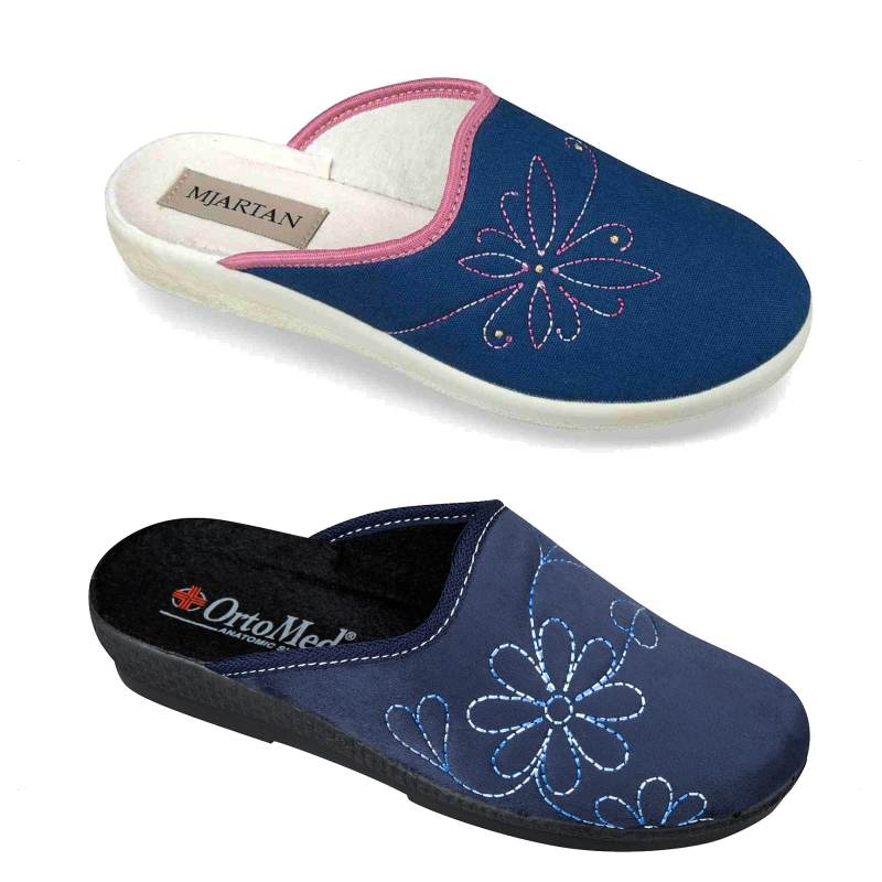 Dámske kvalitné papuče pre ženy na každodenné nosenie. Zvršok je priedušný textil v modrej farbe so vzorom. Stielka je textilná v bielej farbe. Biela podrážka je protišmyková, jednozložková z PU materiálu, priamo vstrekovaná. Je to ekologický materiál, veľmi ľahký, pevný, zabezpečuje dobrú stabilitu a dlhú životnosť.