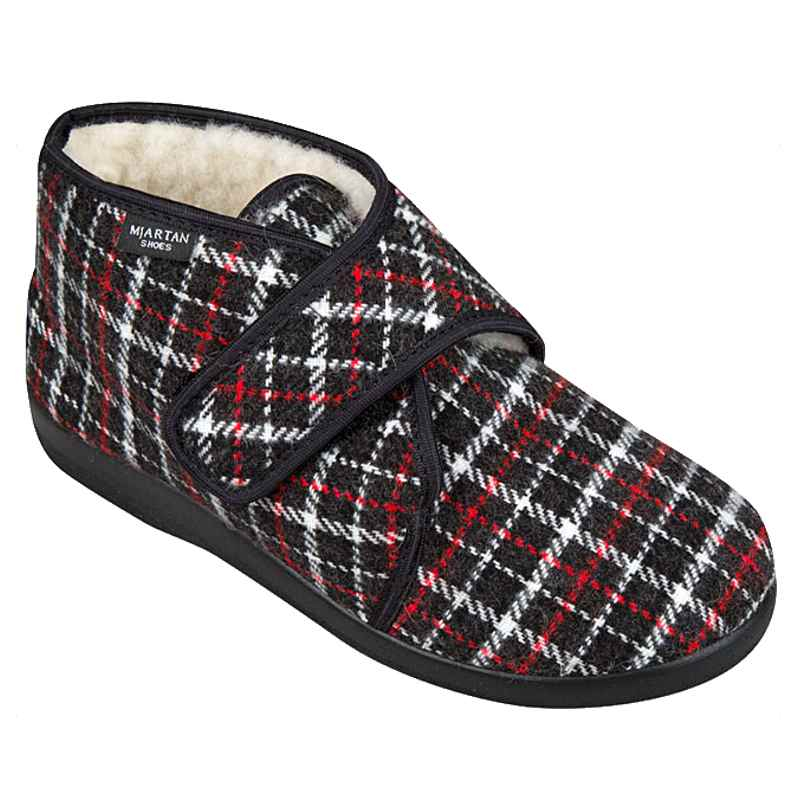 Pohodlné dámske zateplené papuče pre ženy na každodenné nosenie v chladnejšom období. Zvršok je zateplený textil, karo . Celá papuča je zateplená hrejivou vlnou. Zapínanie je na jeden suchý zips. Klasická mäkká a ľahká papučka má uzavretú pätu. Jednozložková podrážka z PU, čiastočne pokrytá textilom, tlmiaca nárazy. Podrážka je priamo vstrekovaná.