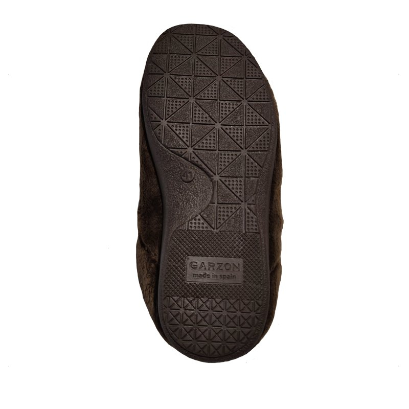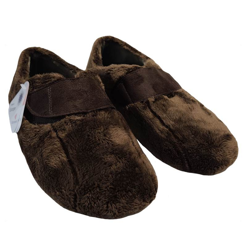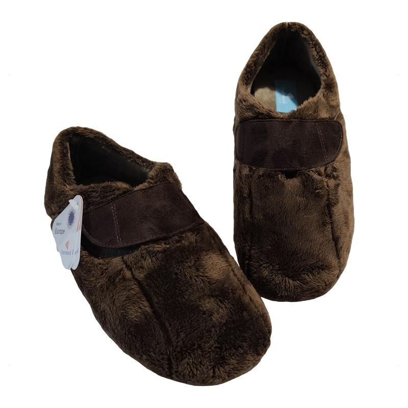 Kvalitné zateplené papuče v hnedej farbe z plyšového materiálu. Zapínanie je na jeden suchý zips. Papuče májú plyšovú podšívku, vyberateľnú stielku a gummenú podrážku. Šírka obuvi G.