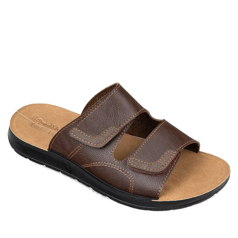 Pánske šľapky v hnedej farbe pre mužov, ktorí potrebujú pohodlnú obuv na každodenné nosenie. Vrchný materiál je zo syntetickej usne (kože), ktorá odoláva opotrebeniu a zároveň je priedušná. Zapínanie je na dva suché zipsy, ktoré umožňujú prispôsobenie šírky obuvi podľa potreby. Čierna podrážka je protišmyková, jednozložková z PU materiálu, priamo vstrekovaná. Je to ekologický materiál, veľmi ľahký, pevný, zabezpečuje dobrú stabilitu a dlhú životnosť.